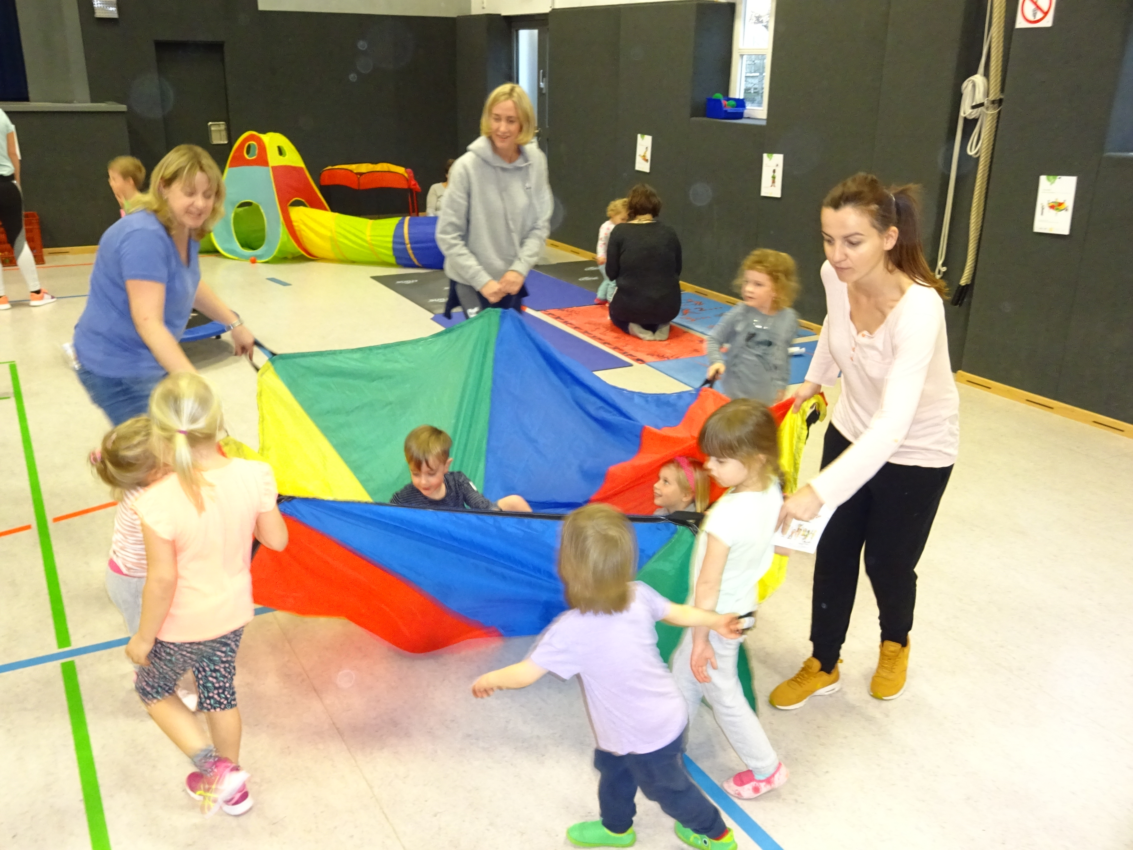 Im Rahmen der bundesweiten Aktion Offensive Kinderturnen hatte die Abteilungsleiterin Wiltrud Rabenau zu Sport, Spiel und Spaß geladen. Beim „Kinderturnabzeichen für alle“ waren die Sinne angesprochen, wie beim Fühlen und Spüren von Gegenständen und der Koordination beim Hantieren mit Tüchern und Bällen. Balance auf Seilen und Balken war ebenso gefragt wie Rhythmusübungen und die Pferdekutsche. Besonderen Spaß hatten auch die mithelfenden Eltern bei der Teamarbeit mit dem Fallschirm als Karussell.