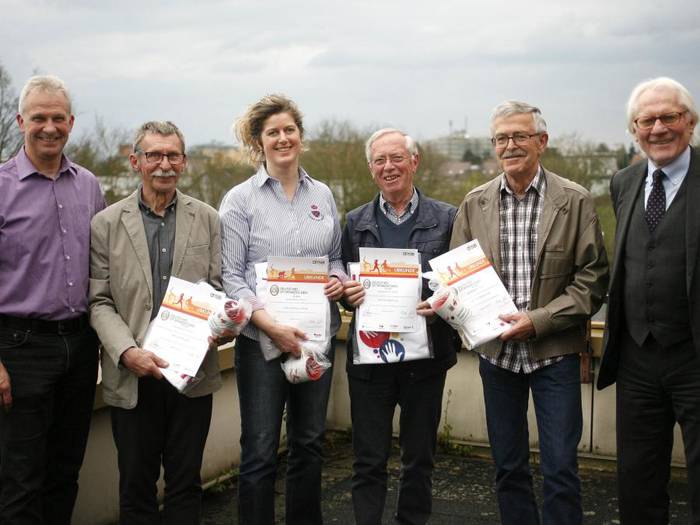 Schon seit 25 Jahren als Sportabzeichen-Prüfer im Einsatz sind die Geehrten. Im dritten Stock des Anzeiger-Gebäudes wurden Carmen Leidner (TV Langsdorf), Werner Just (TSG Lollar), Winfried Nau (Kneipp-Verein Grünberg) und Wolfgang Vogel vom SV Staufenberg mit einer Urkunde und einem Präsent ausgezeichnet.